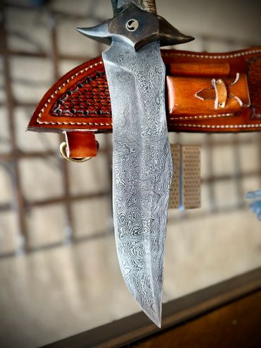 I love delivering my work to customers. This Bowie and Hatchet is on its way. A 10" Bowie with a full guard and frame handle with stabilized old oak handle in a take on a coffin handle. It comes with 2 sheaths for a scout carry (back carry) and a traditional 2 part sheath that will separate to a scabbard and belt loop. The tomahawk is has a 3 ½" bit and 12 oak framed handle to match the bowie. The sheath can be carried on a belt or added to any pack. Take this knife and hunting or camping and you are set for wilderness survival