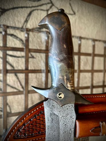 8" 80CRV2 Take down Bowie blade with a ring guard and elk antler handle. A hunter that will wow everyone at camp with its looks and utility. Complete with 2 sheaths. A traditional 2 part sheath that will come apart for sitting and a scout carry sheath