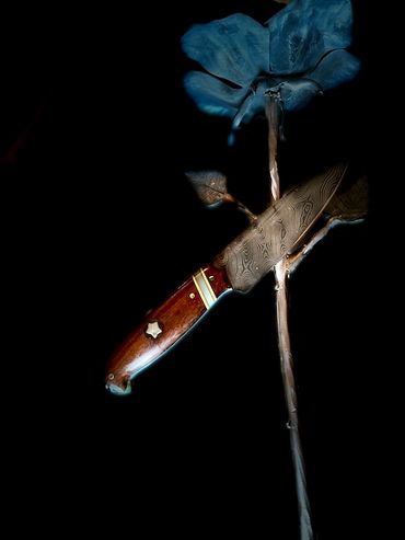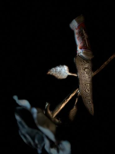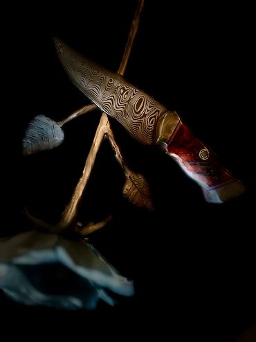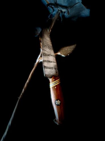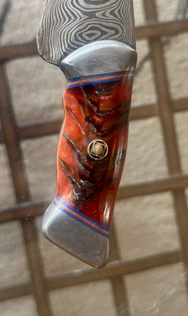 240 layers of 1084 and 15n20 high carbon steel forged as a Cue Mai damascus around a central 1084 blade. Copper fittings and an antler supplied by the hunter that commissioned it. 3 /12" blade and 8" overall length. This is a "sharp" looking knife that complements any skinning kit.
