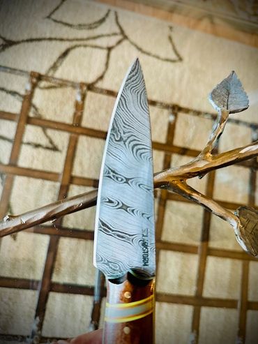 2 - 345 layer ladder pattern damascus chefs knives. 8.25" blade with stabilized burl and brass highlights. And, its little brother, a 6" version.
