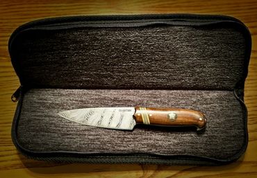 4” Twist Damascus blade with Epe Wood with a charm from a beloved pet's collar. The micarta liner and stripe match the pets eyes and the brown and yellow stripes match the dogs colors