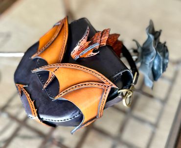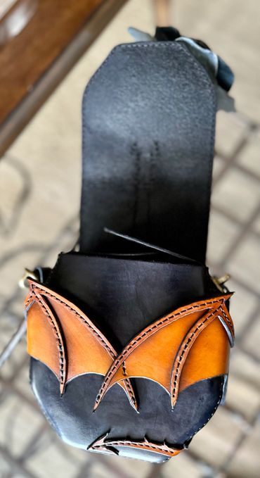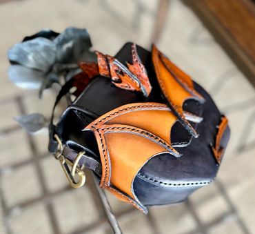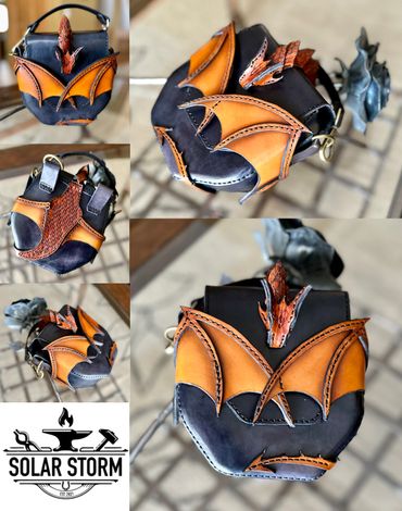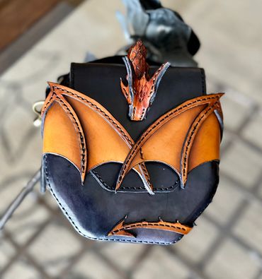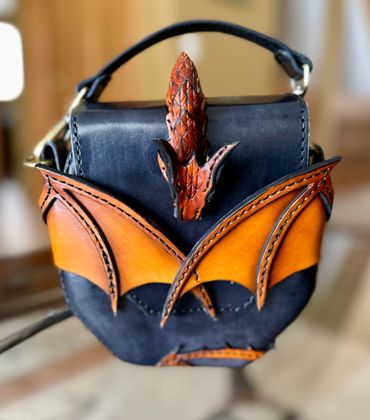 Dragon riders unite! This will turn heads. Can be worn as a hip bag or carried with the handle. The dragon embraces the flap and the tabs ensure that this bag of holding holds on to your contents. This one is available or order yours in any color.