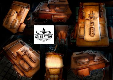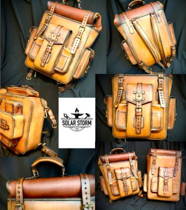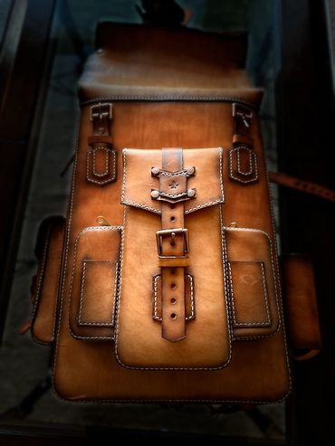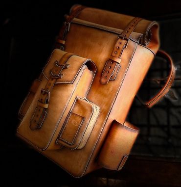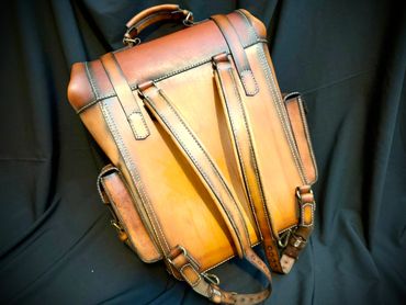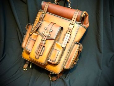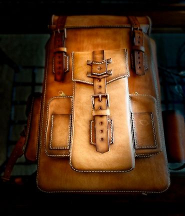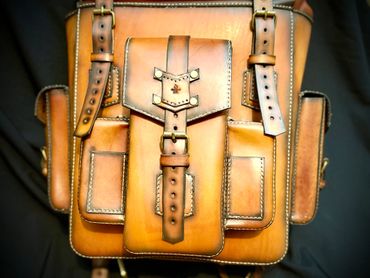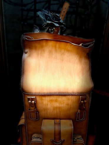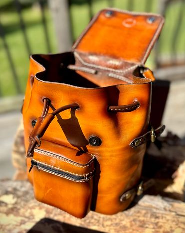 This backpack is 100% 5oz Alberta veg tanned leather. The main compartment measures 17" x 11.5" x 5.5", weighing only 3 lbs 1 oz, giving you ample room. The beauty of this pack is that if you need more room, the roll top expands for an additional 6" of space. There is a large quick access front pocket, flanked by two smaller pockets for quick access. The larger side pocket and water bottle carrier are located for easy access. The roll top unsnaps for easy access or button it up for extra capacity
