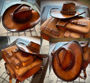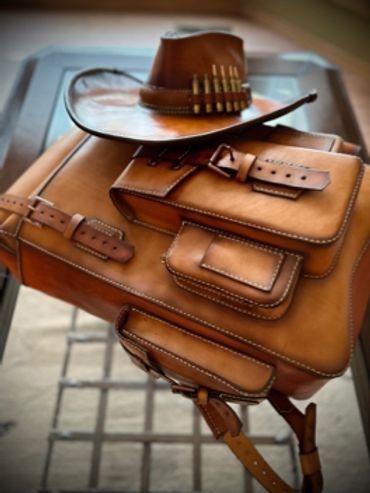 Get ready for adventure! This adventure hat is 100% 5oz Alberta veg tanned leather. Hand stitched and treated to withstand the weather. The brim can be folded to suit you taste. Available in custom sizes and calibers. Supply your own or order with the supplied dummy rounds.