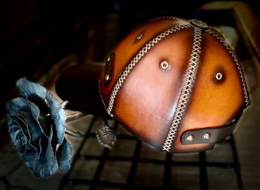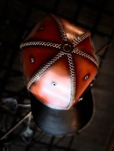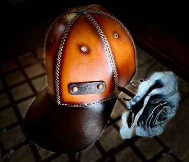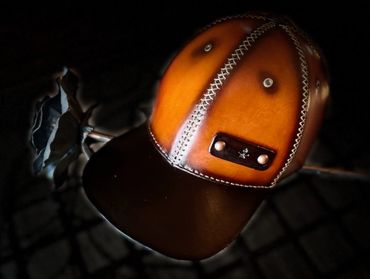 100% leather baseball hat. Available in S, M, L. Each size has 3 snaps for further refinement.