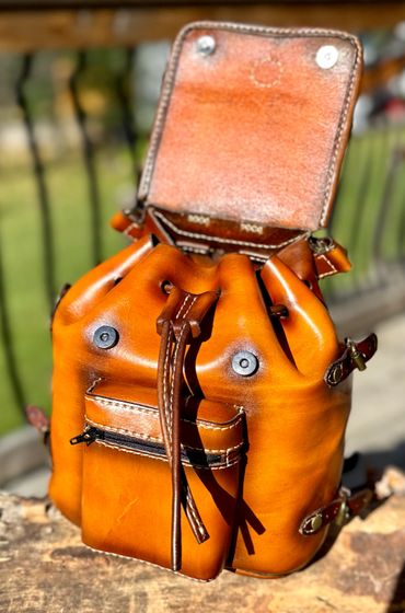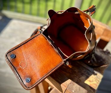 Get ready for adventure! This bag is 100% 5oz Alberta veg tanned leather. Hand stitched and treated to withstand the weather. The drawstring opens to a wide bag and tightens up to keep the contents secure.