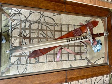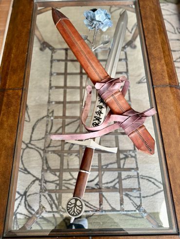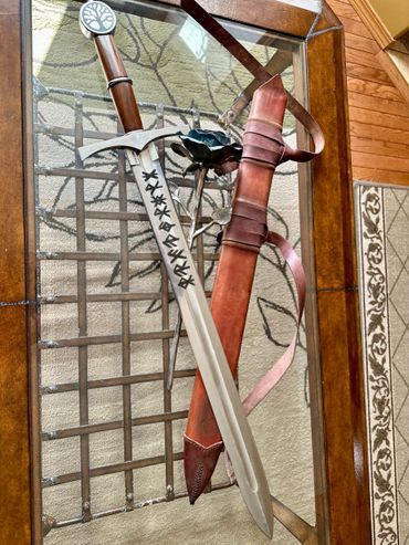 36" OAL, 28" blade, broad sword made from 5160 spring steel. Ironwood handle. Etched with Bind runes . Sword will be used as part of a Druidic wedding ceremony. Tree of life adorns the pommel and the blade is marked with