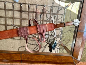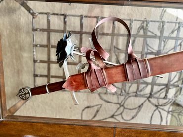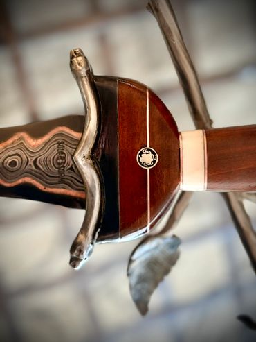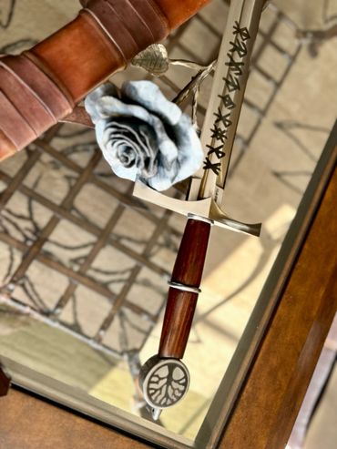 Arming sword - 26.5" blade. Fluted Ash burl with gold plated brass wire wrap. Coat of arms on the cross guard and STRENGTH etched around the pommel. 13" Dagger with matching handle and guard and CHARACTER around the pommel and a 27" Rapier with matching guard and HUMILITY around the pommel