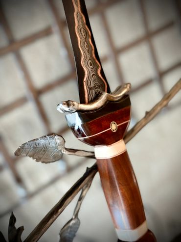 20.5" 440 layer CuMai Kopis. OAL 26". Fake Ivory and black micarta handle with copper accents. Medusa's head adorns the pommel carved from Elk Antler. Scabbard is burnt Ashwood and copper fittings with leather saddle straps carved with snake skin scales. See the youtube videos of this build.